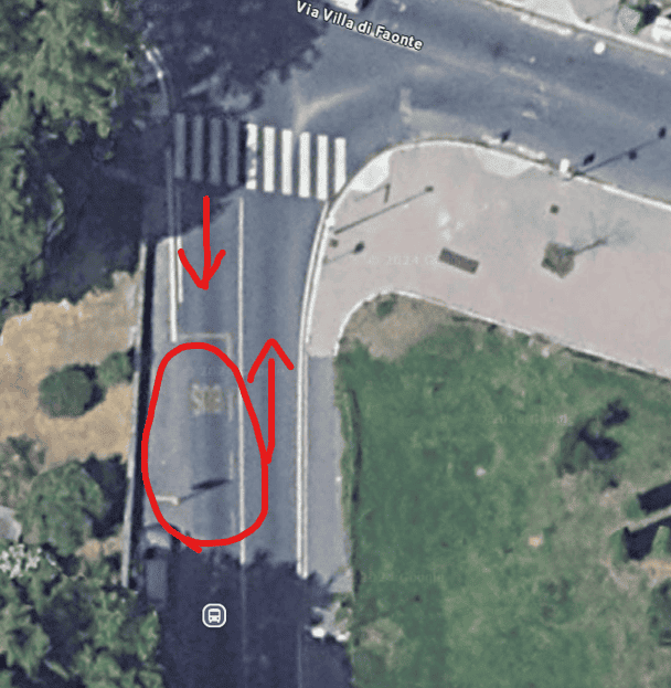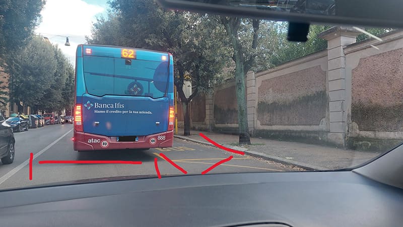 Nell’esempio in foto qui sotto, è possibile vedere, come nonostante sia presente una fermata bus completamente disponibile nella zona laterale alla strada, il bus, rimanga comunque nel mezzo della strada per effettuare la fermata.
